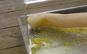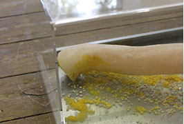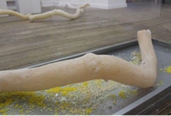 The hybrid sculptural setting connects the slime mold’s natural habitat - the woods - with the life it has been habituated to lead in isolated, controlled and monitored human captivity - the petri-dish.