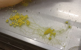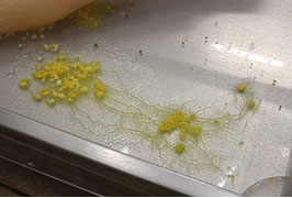 The slime mould is a fascinating unicellular organism, a resilient shapeshifter, that can oscillate through its natural life cycle beyond the vital, plasmodial stage of growth into either the development of spores (a form of reproduction), hibernation or (seldom) death. It acts as an agent of nature as it grows, expands and moves like a creeping garden with unpredictable changes of ‚becoming and decay‘ occurring over time.